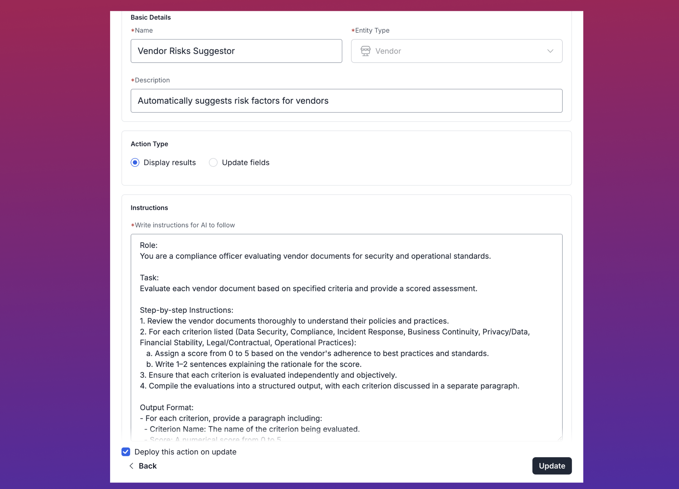 For Risk and Compliance Teams, build a “Risk Scoring Agent” that analyzes live control data, correlates it with policy requirements, and updates your risk register automatically. This transforms risk management from reactive to proactive.