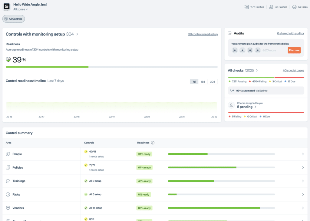 Sprinto is built for that stage. The platform’s autonomous compliance workflows give SaaS teams one operating layer for ISO 27001 with cloud integrations to pull evidence automatically, policy and training workflows to formalize people controls, risk registers and gap views to prioritize remediation, and a live dashboard that shows which controls are healthy, drifting, or overdue.