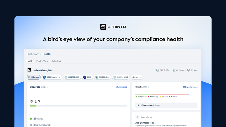 Sprinto is a compliance automation platform designed to help small and mid-market businesses stay audit-ready without heavy effort. Through automated workflows and continuous monitoring, Sprinto simplifies complex compliance processes – everything from evidence collection and control to risk assessments and reporting.