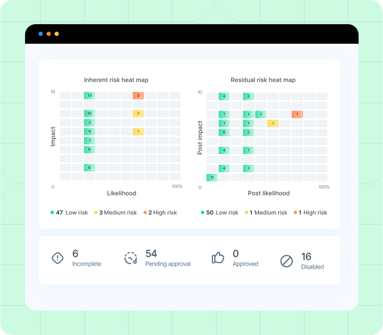 Use Sprinto’s built-in risk register or bring your own to build a connected view of assets, risks, and controls. Score risks against assets using industry benchmarks to hedge better and ensure the right set of controls. Assign risk owners, set up mitigation mechanisms, monitor risk-related controls, and ensure alignment with compliance.