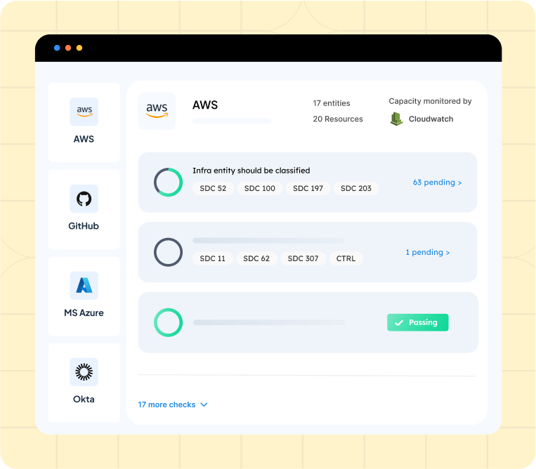 Sprinto’s continuous control monitoring ensures 24×7 compliance by tracking assets and controls against compliance criteria regularly. Maintain control health via regular testing to detect failures & misconfigurations, streamline remediation via context-rich notifications, and collect accurate, time-stamped evidence on a dedicated dashboard.